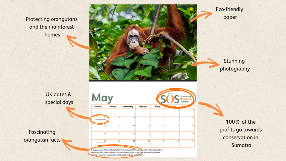 - Key UK Dates & Special Days: Alongside UK holidays, we’ve highlighted important dates like International Orangutan Day, making it even easier to stay connected to our mission throughout the year.